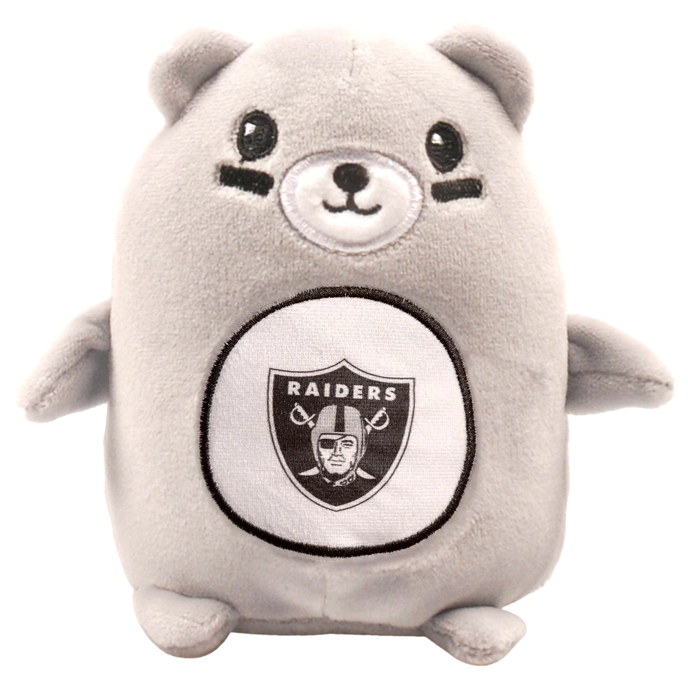 The Raiders Bear Smusherz Plush is the perfect pal for the Raiders fan in your life! This plush features sublimated team shield logo print and eye black embroidery so everyone knows who your team is. Measures approximately 4.5" tall. 100% polyester fiber.