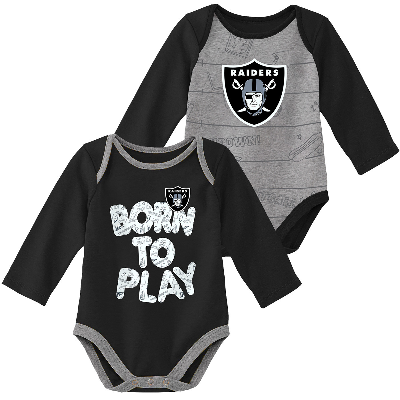 The Raiders Infant Born To Play Set by Outerstuff includes two long sleeve creepers designed with thick, mineral wash fabrication. Features the team shield logo and other graphics printed across the body. 100% soft cotton.