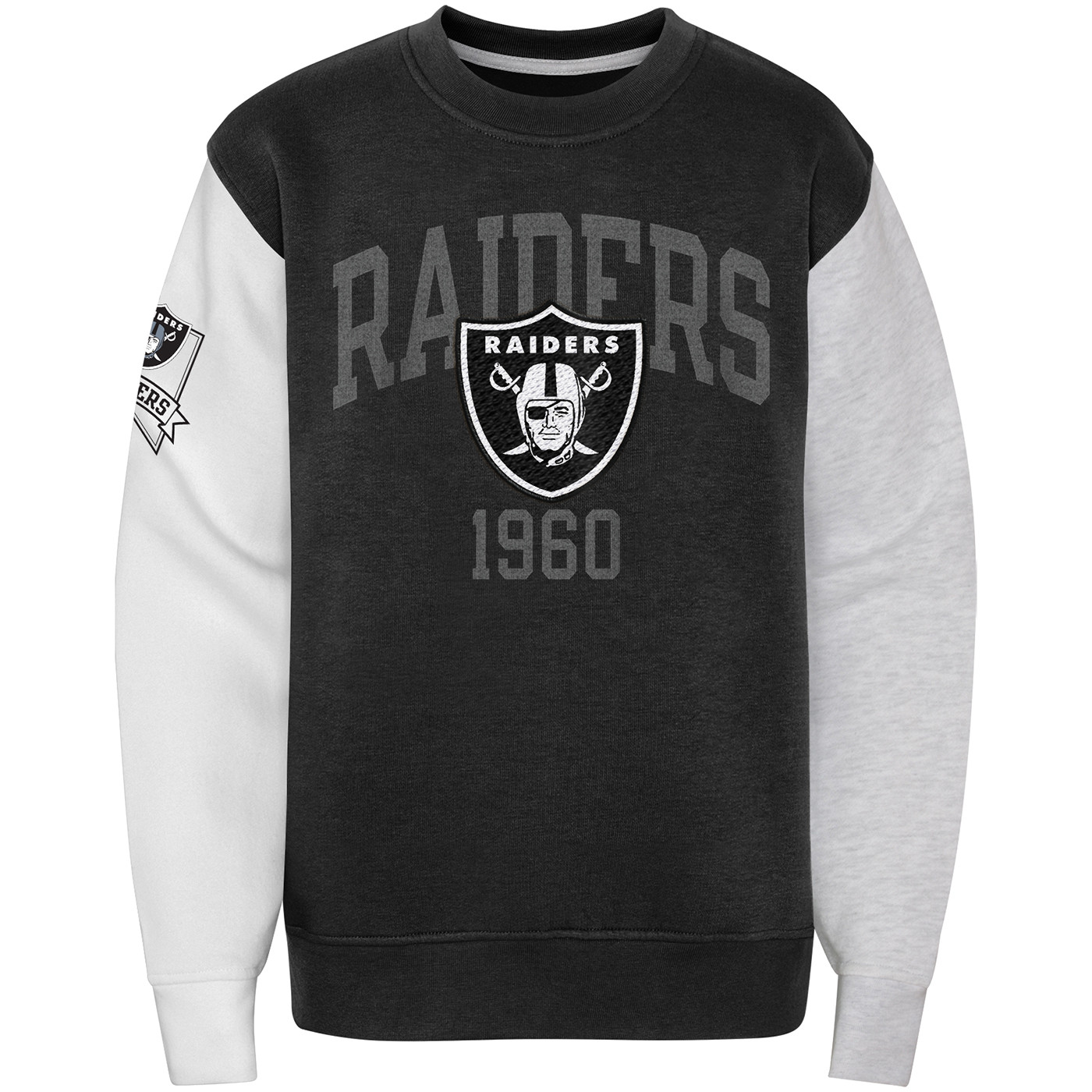 The Raiders Juvenile 3rd and Goal Crew by Outerstuff is designed with alternating heather gray, black, and white garment washed fleece fabrication for a cozy fit. Features soft hand "Raiders" and "1960" print with large team shield logo applique over top at center chest. Made from cotton, polyester.
