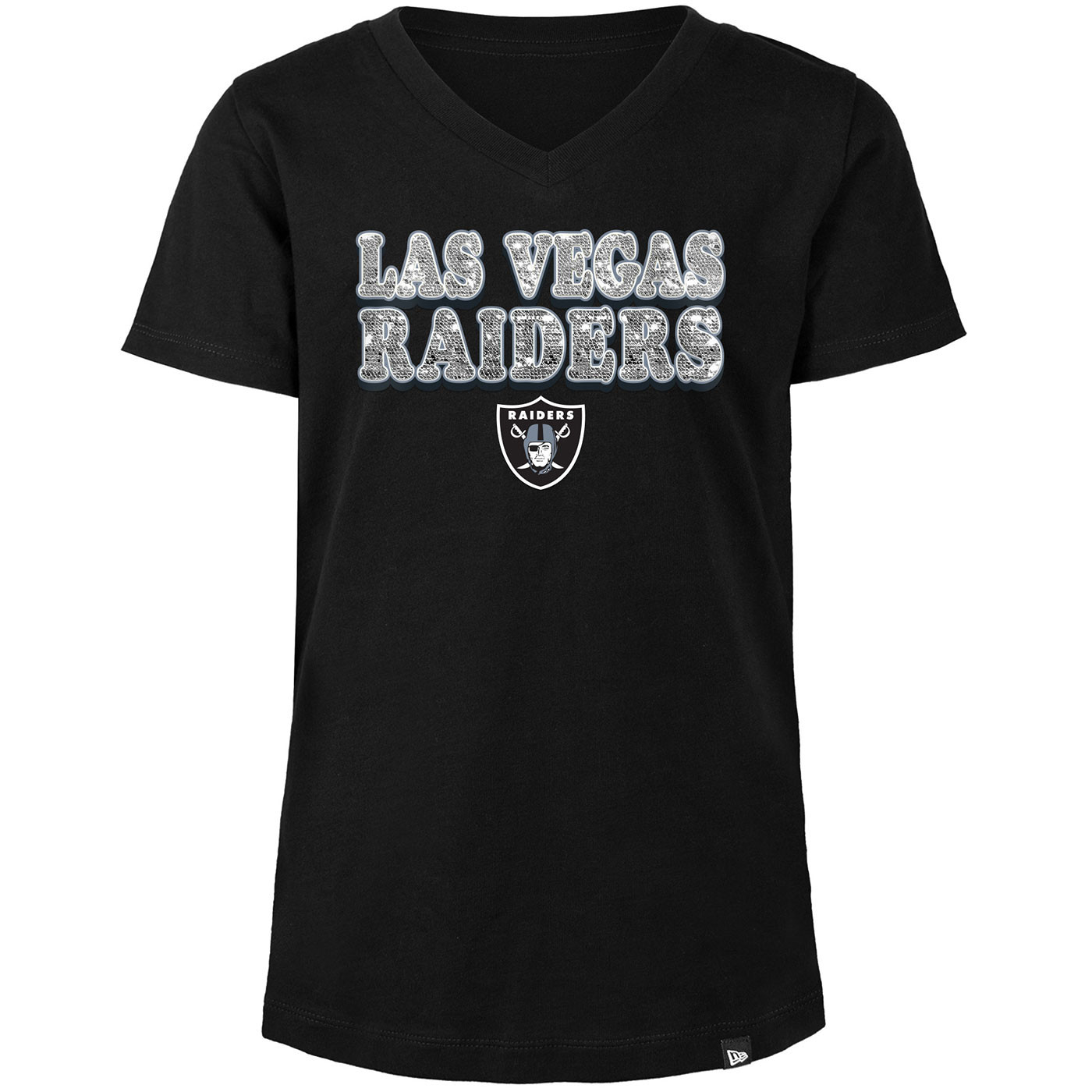 The Raiders New Era Girls Flip Sequin Tee is perfect for any young festive fan! This youth V-neck tee features a flip sequin Las Vegas Raiders graphic across the chest with a small team shield logo printed below. 100% cotton.