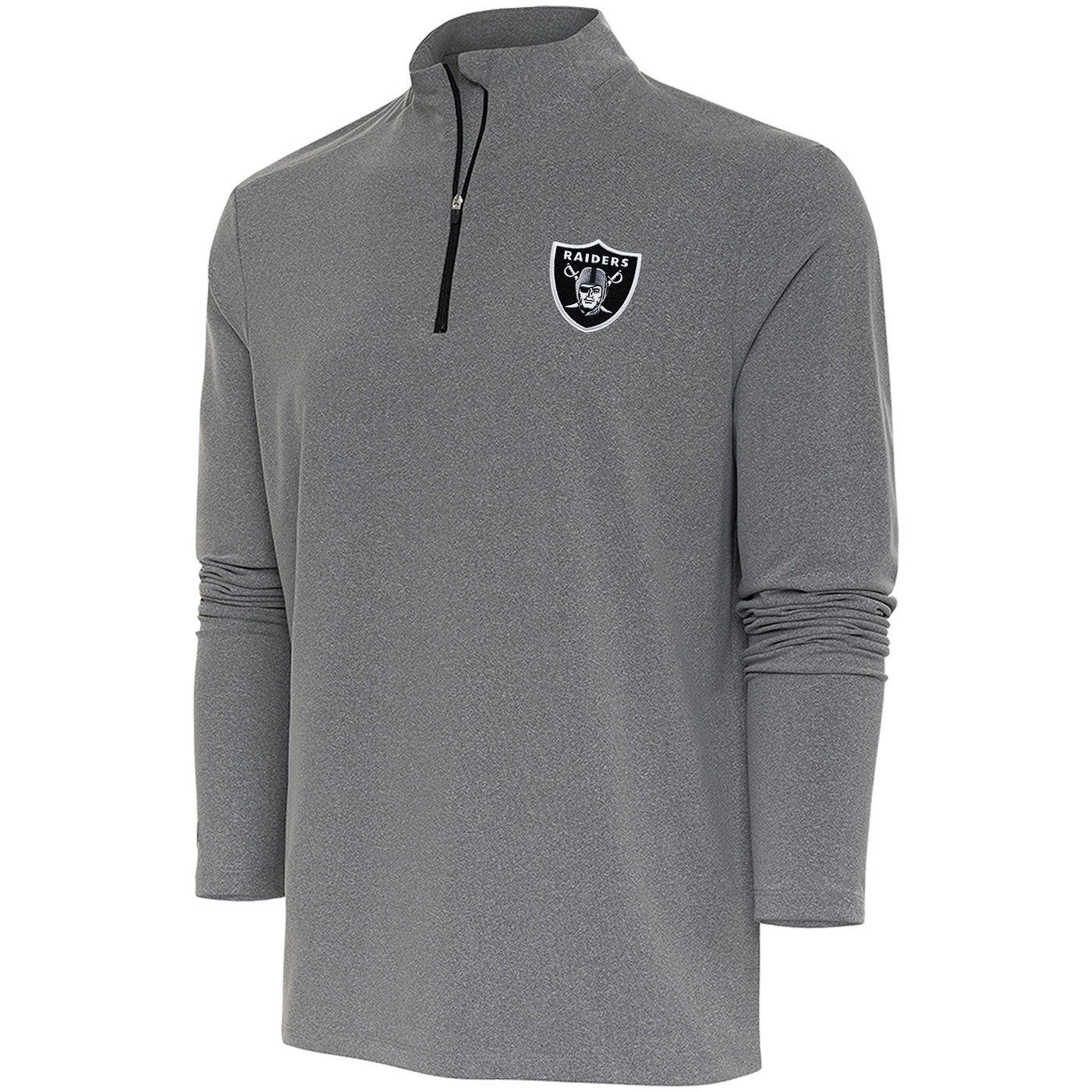 The Raiders Antigua Swing Set Quarter Zip is designed with matte jersey fabrication for a lightweight stretchy fit. This heather gray pullover is slightly drier to the touch and has a mock collar and zipper garage that elevates your everyday performance-wear. Additional team details include a Raiders shield logo at upper left chest. 92% polyester, 8% spandex.