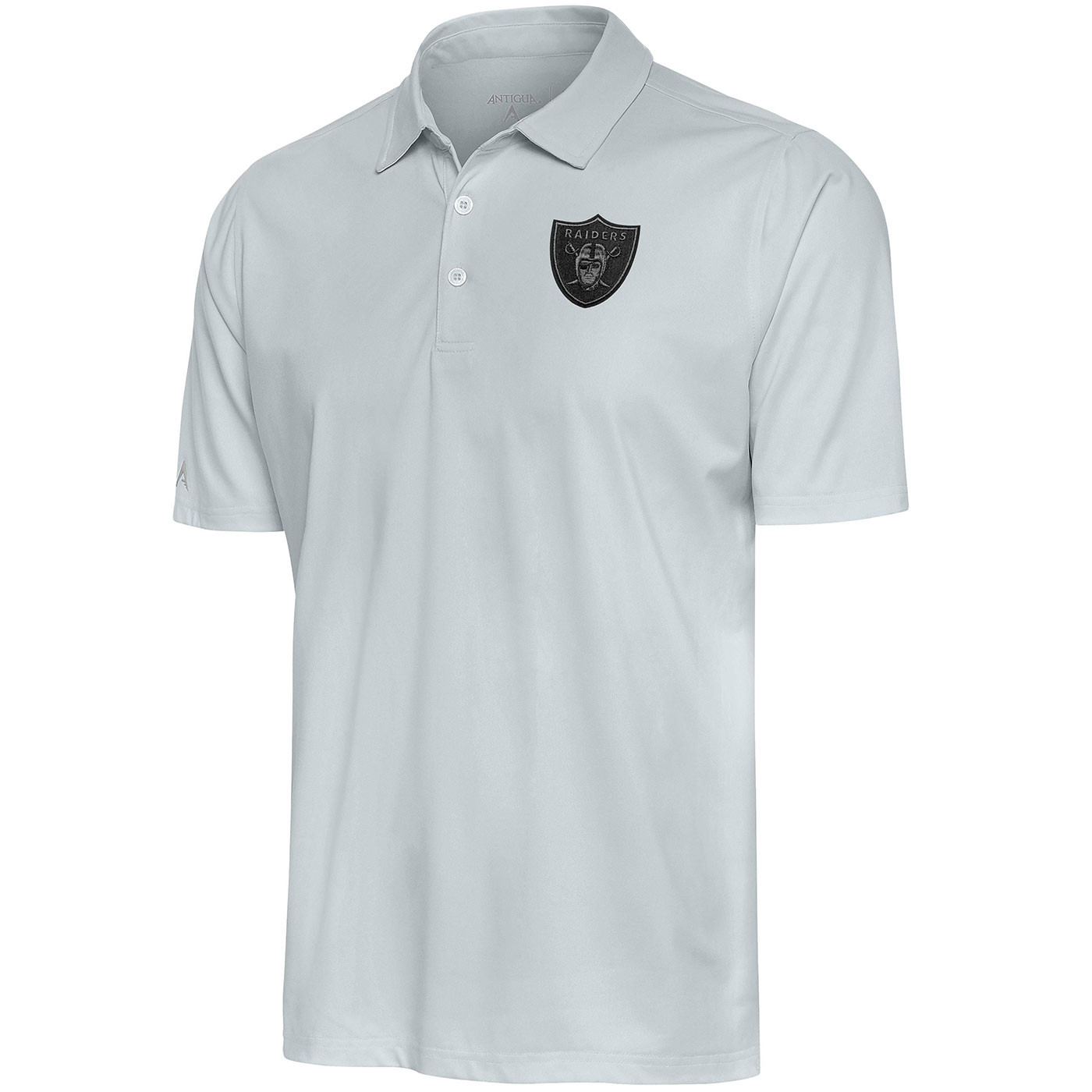 The Raiders Antigua Score Polo is designed with matte gray jersey fabrication for a slightly drier touch. This short sleeve polo has a self-collar, collar band, and hem vents and features a tonal black team shield logo at upper left chest. 94% polyester, 6% spandex.