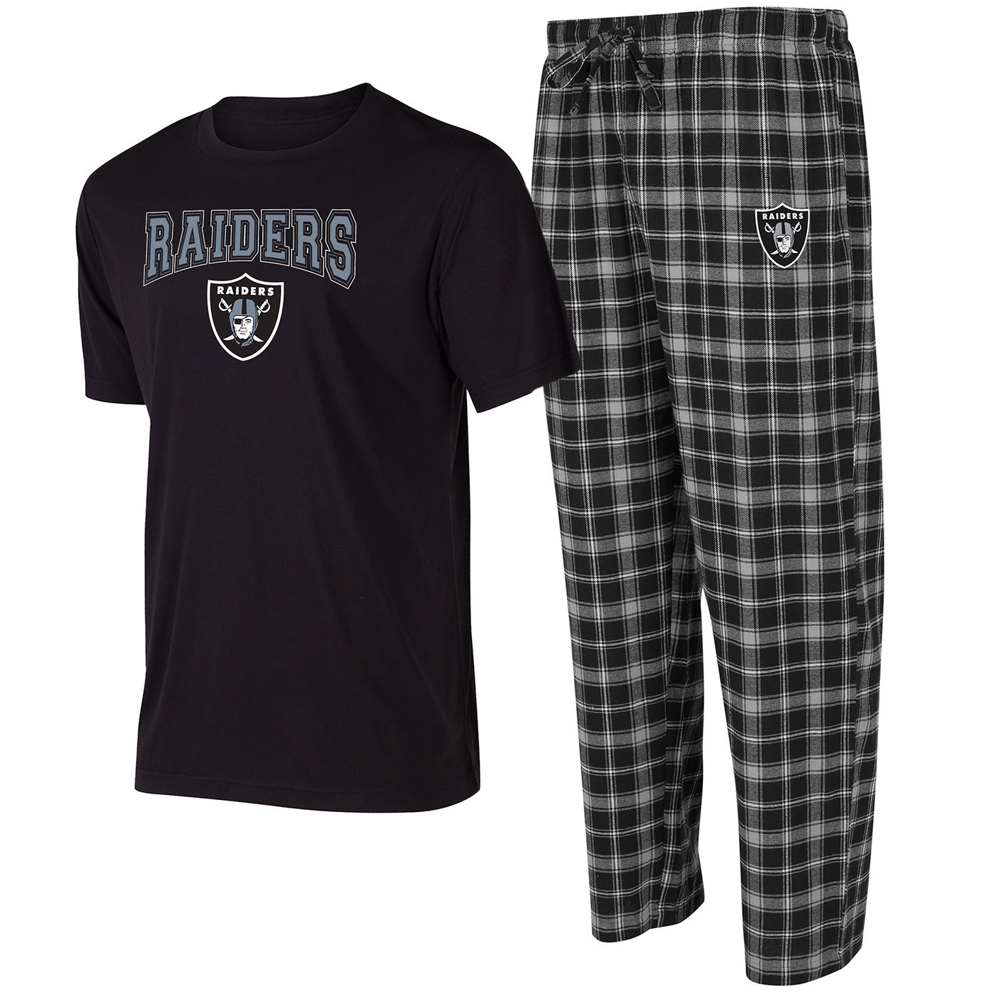 Lounge around in the Raiders Men's Arctic Pants & Top Set by Concepts Sport. This sleepwear set includes a soft short sleeve top and drawstring flannel bottoms. Features "Raiders" and team shield logo print across the chest and a team shield logo at upper left leg.