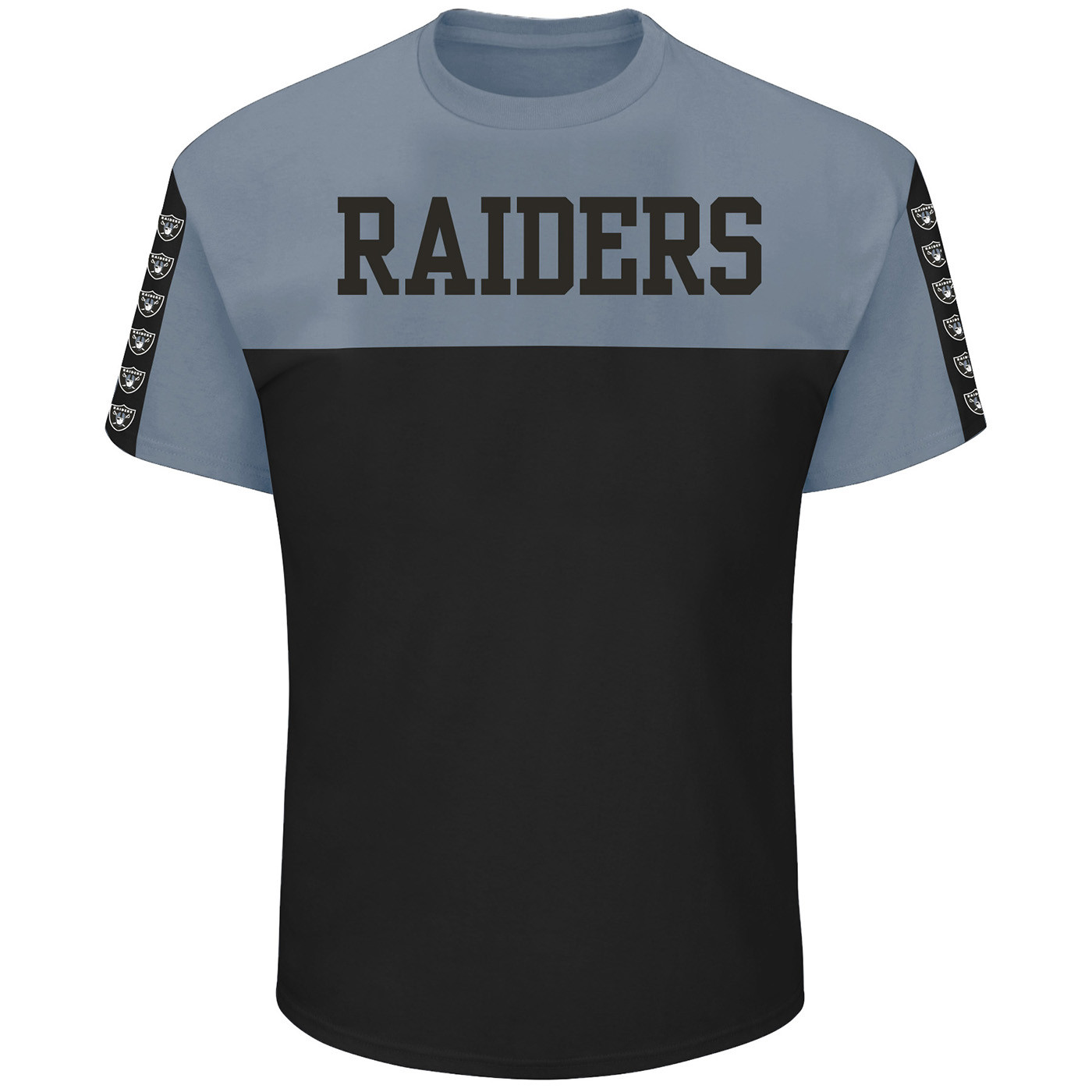 The Raiders Big & Tall Sleeve Tapes Tee is designed with an alternate team-colored chest and sleeves. Features the team name printed across the chest with repeat team shield logo print down the sleeves. Available in extended big sizing. 100% polyester.