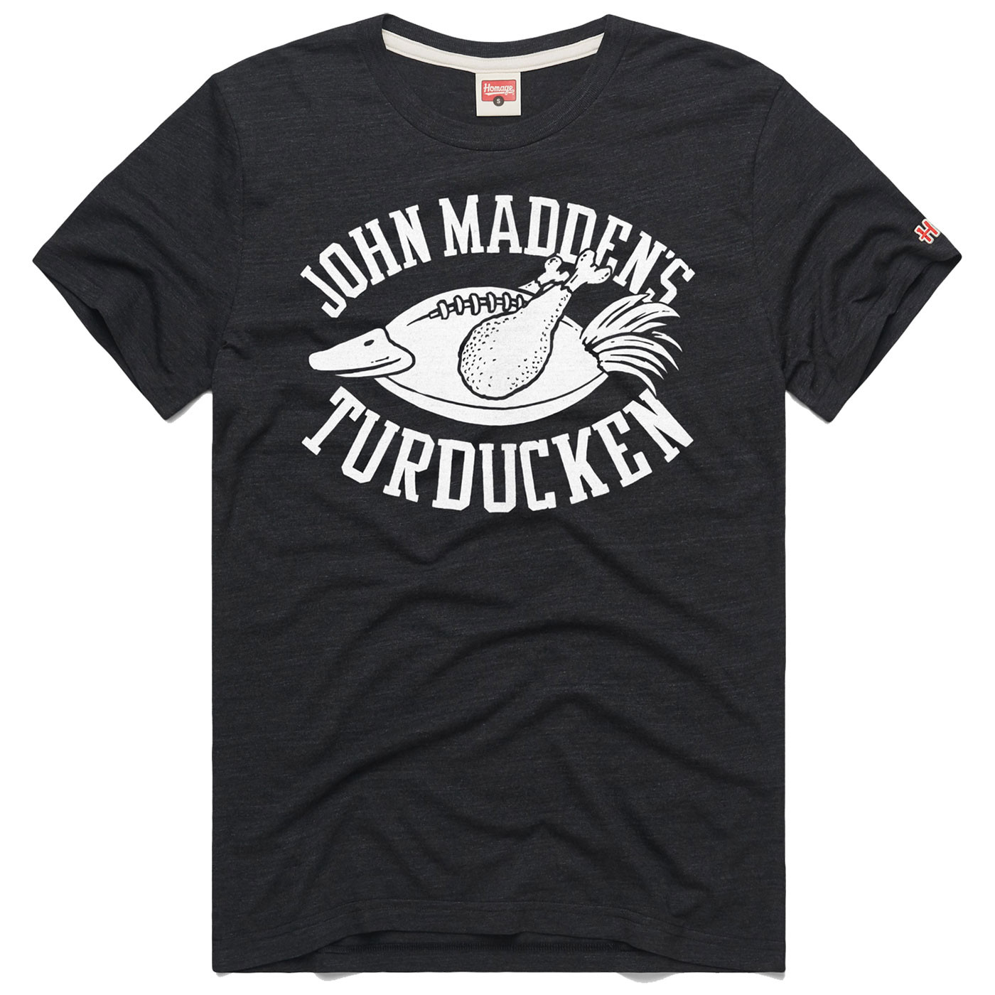 Celebrate tradition! The Raiders Homage Madden Turducken Tee is a unisex crewneck that has a relaxed fit. This super-soft tee features a screen printed graphic design showing off John Madden's Turducken. 50% polyester, 25% cotton, 25% rayon.