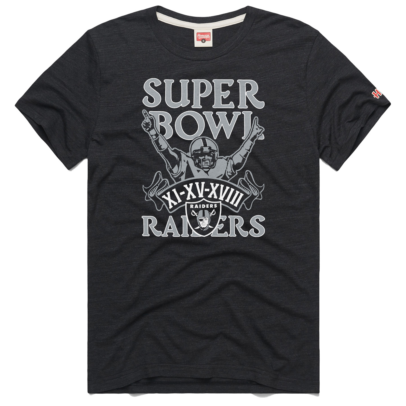 Honor your team's legacy! The heathered unisex Raiders Homage Three Time Super Bowl Champions Tee has a relaxed fit and features commemorative Super Bowl XI, XV, and XVIII graphics printed across the body. Polyester, cotton and rayon blend.