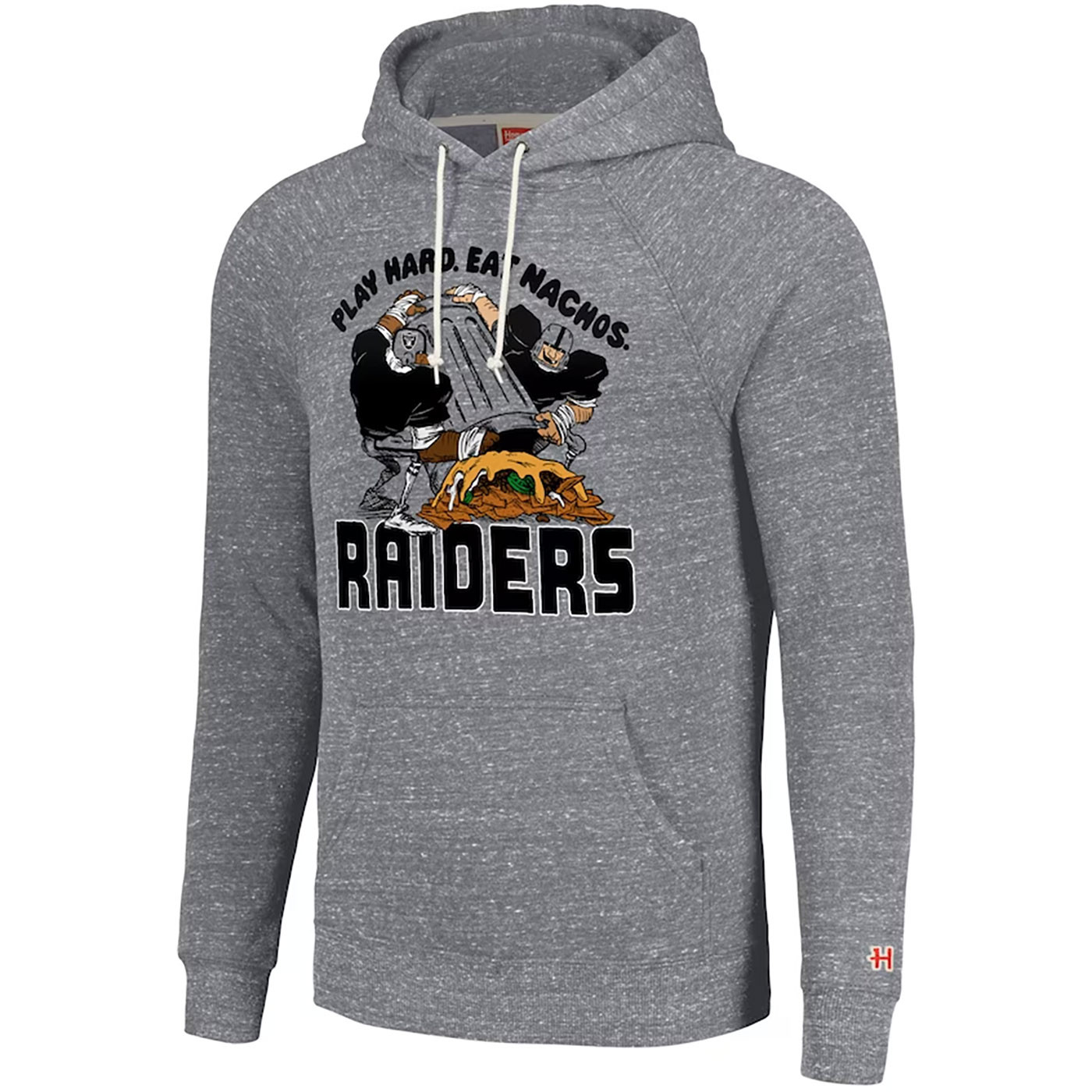 Celebrate the best tailgate food in the league! The Raiders Homage x Flavortown Play Hard Eat Nachos Hoodie is a unisex hoodie that has a relaxed fit. This midweight fleece hoodie features a screen printed graphic design showing off one of Allegiant Stadium's most notable dishes. 50% polyester, 25% cotton, 25% rayon.