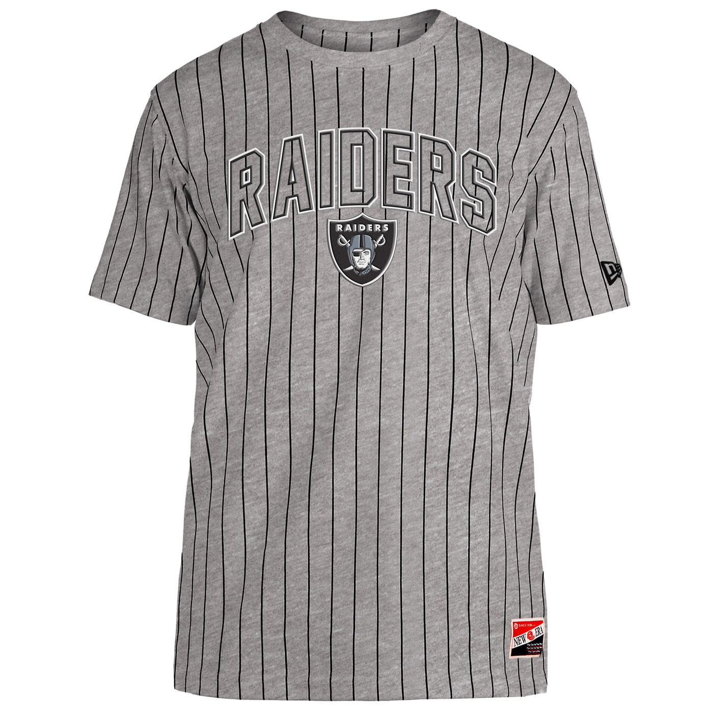 Showcase your team pride with the New Era Short Sleeve Crew Neck Striped Tee. This stylish pinstripe t-shirt is adorned with an embroidered team shield logo and bold arch Raiders embroidery. 63% cotton, 37% polyester.
