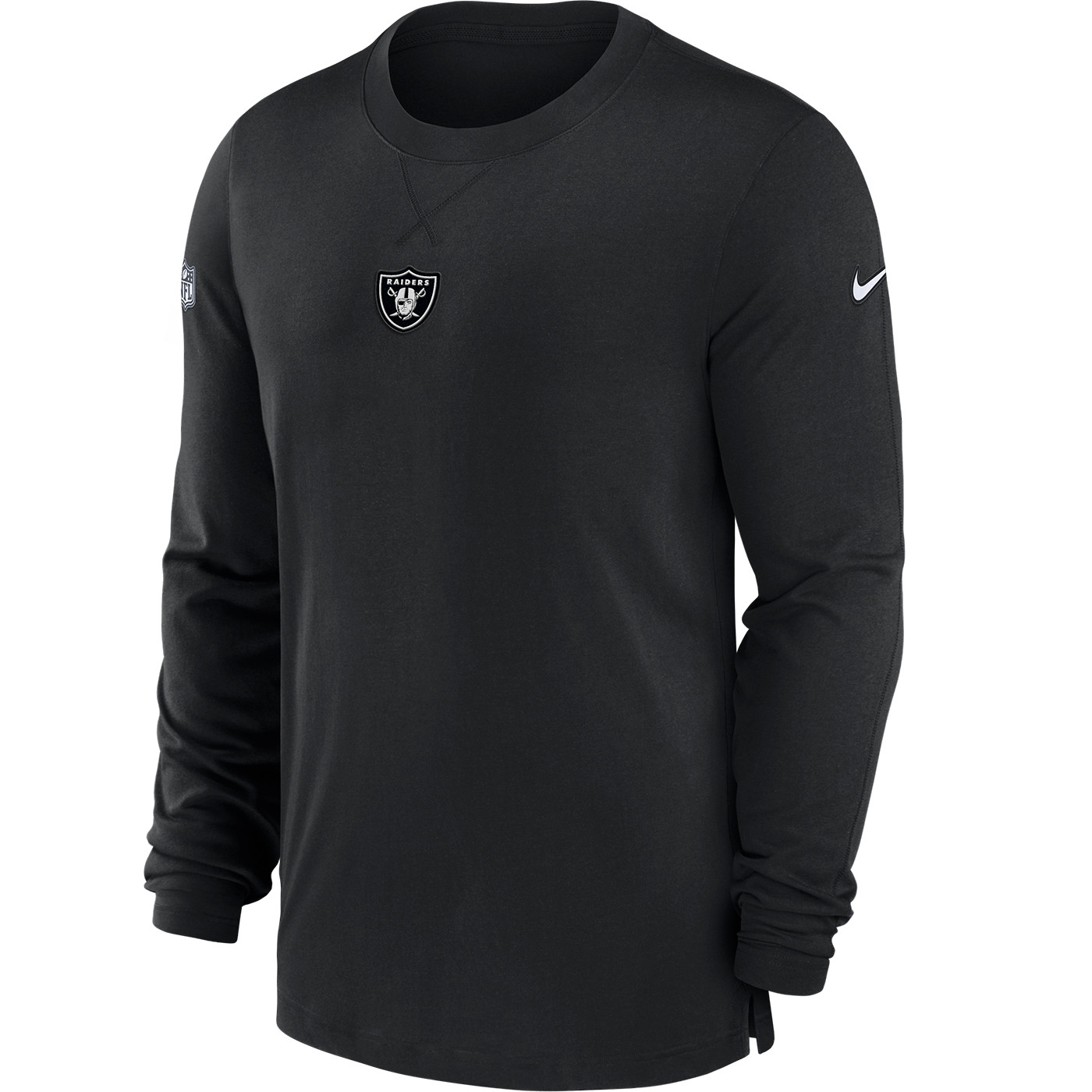 Wear what the pros wear! Made with coaches and players in mind, the Raiders Nike Dri-FIT Player Long Sleeve Top is designed with tri-blend heather jersey fabrication that keeps you dry and comfortable. This performance tee has authentic football notch neck stitching and side vents for mobility and features recycled team shield logo twill patch embroidery at the upper chest. 75% recycled polyester, 13% organic cotton, 12% rayon.