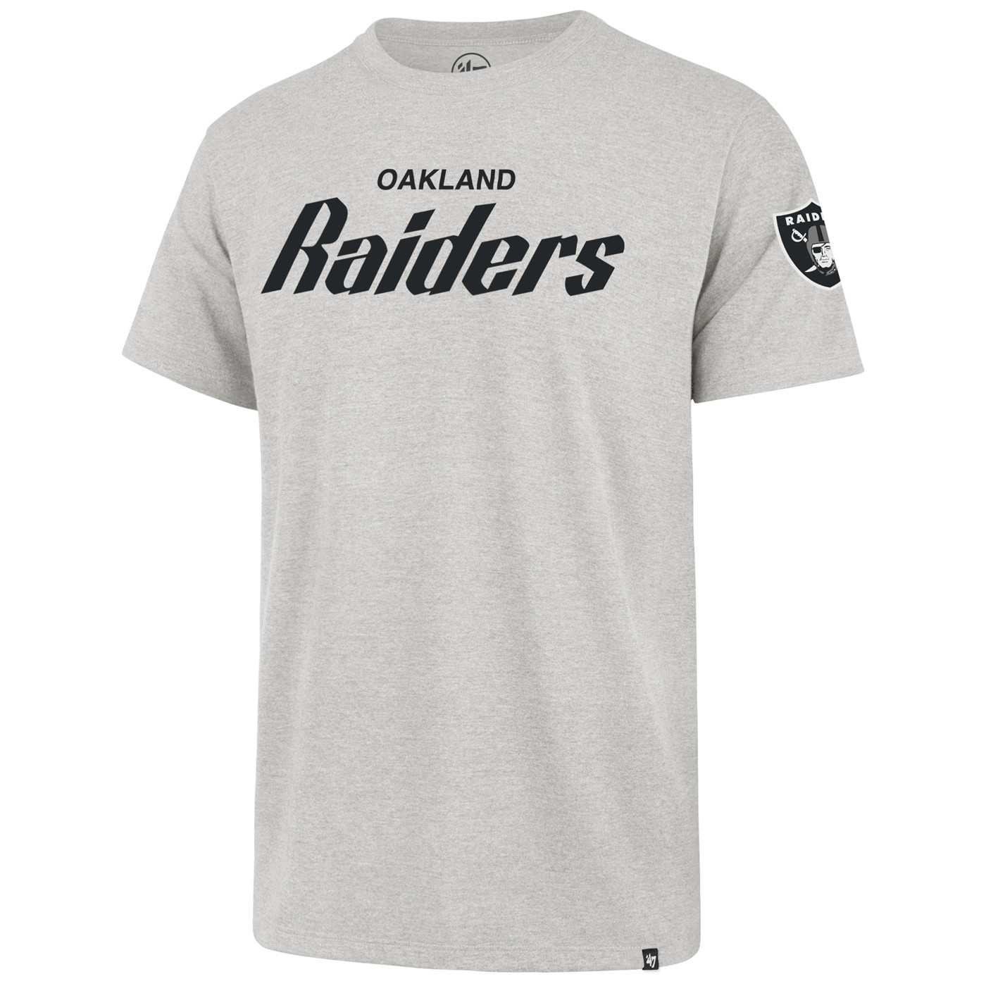 Display your Raiders devotion with the '47 Premier Oakland Two Peat Franklin Tee. Designed with heathered fabrication, this ribbed neck shirt features a printed Oakland Raiders heritage wordmark logo across the front with a printed team shield logo on the sleeve, offering a stylish way to express pride for your city and Raider Nation. 100% cotton.