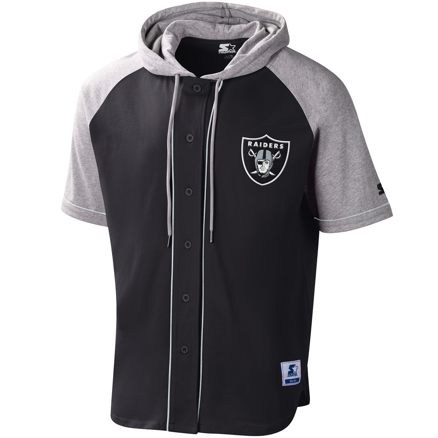 The Raiders Starter Catch Baseball Fashion Top is designed with authentic plaited jersey fabrication that is soft and moisture-wicking for all-day comfort. This hooded top has a heather gray hood and sleeves with white piping at the center front placket and sleeve cuffs. Features an embroidered team shield logo at upper left chest and Starter woven label jock tag at front hem. 100% cotton.