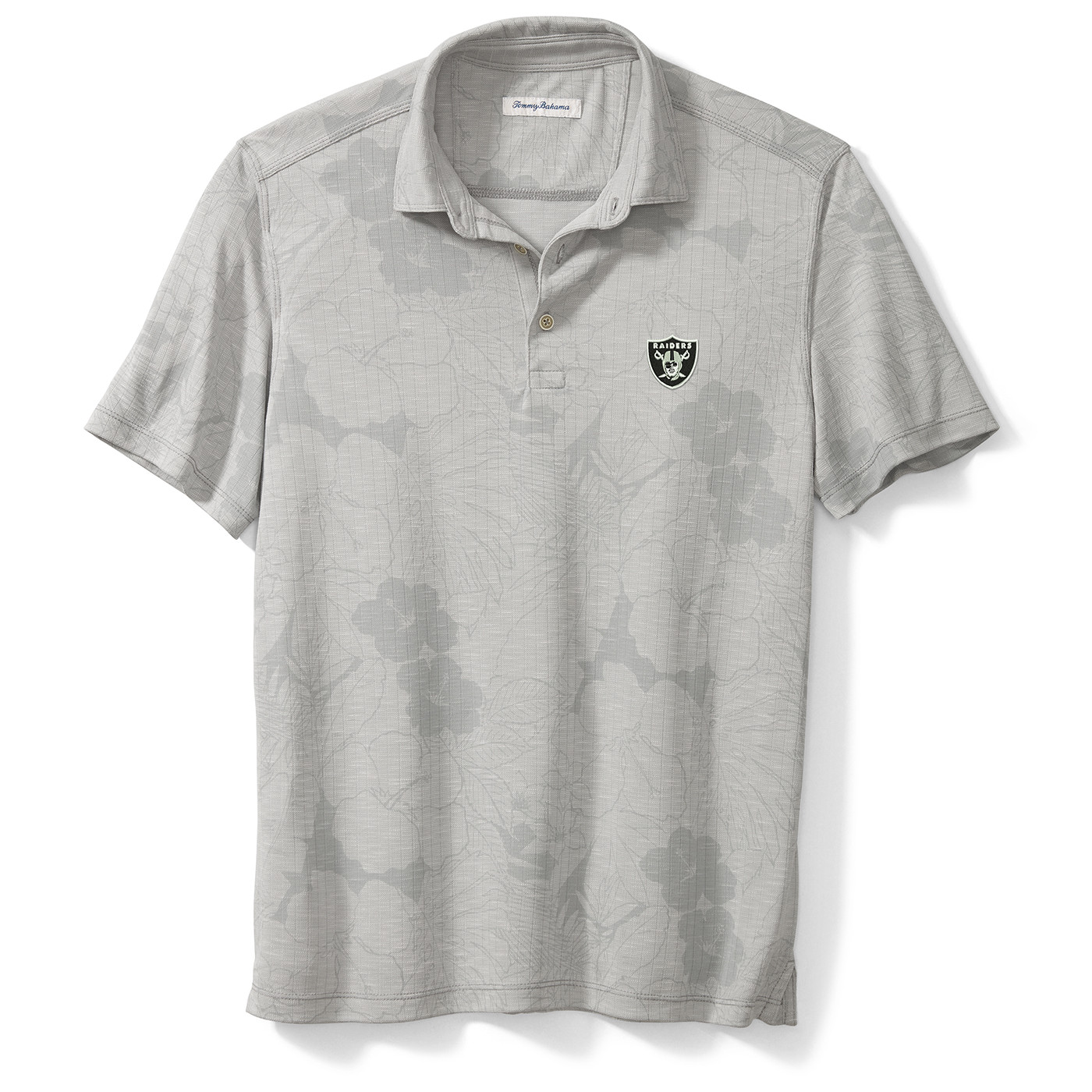 The Raiders Tommy Bahama Miramar Blooms Polo is designed with lightweight, sustainable fabrication perfect for warm weather. This short sleeve polo is absorbent and has an all-over floral overprint, plus a team shield logo at upper left chest. Made from Tencel modal, recycled polyester.
