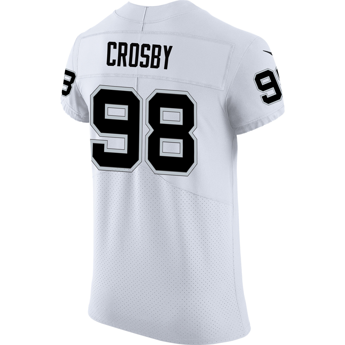 Wear what the team wears! This Nike Maxx Crosby Elite Jersey is made of a polyester mesh body with nylon yoke and sleeves, plus ribbed knit v-neck taping. Tackle twill numbers and letters are sewn on. Jock tag on lower left front. Body: 86% nylon, 14% spandex. Mesh: 88% nylon, 12% spandex. Rib: 91% nylon, 9% polyester.