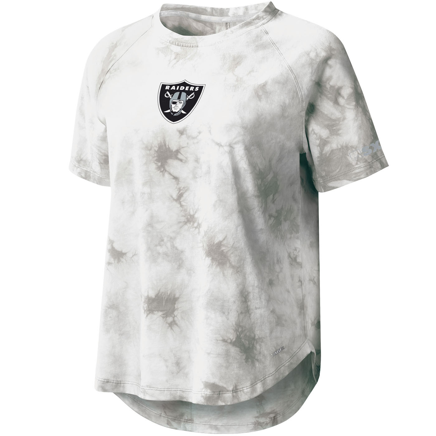The Raiders MSX Women's Ella Tie Dye Tee is designed with soft, stretchy fabrication that has a muted gray tie dye pattern. This slouchy tee has a relaxed fit and droptail hem and features a reflective heat seal MSX logo and MSX logo metal bar. Team-specific detailing includes team shield logo print at the chest and "Raiders Football" print down the back seam. 100% cotton.