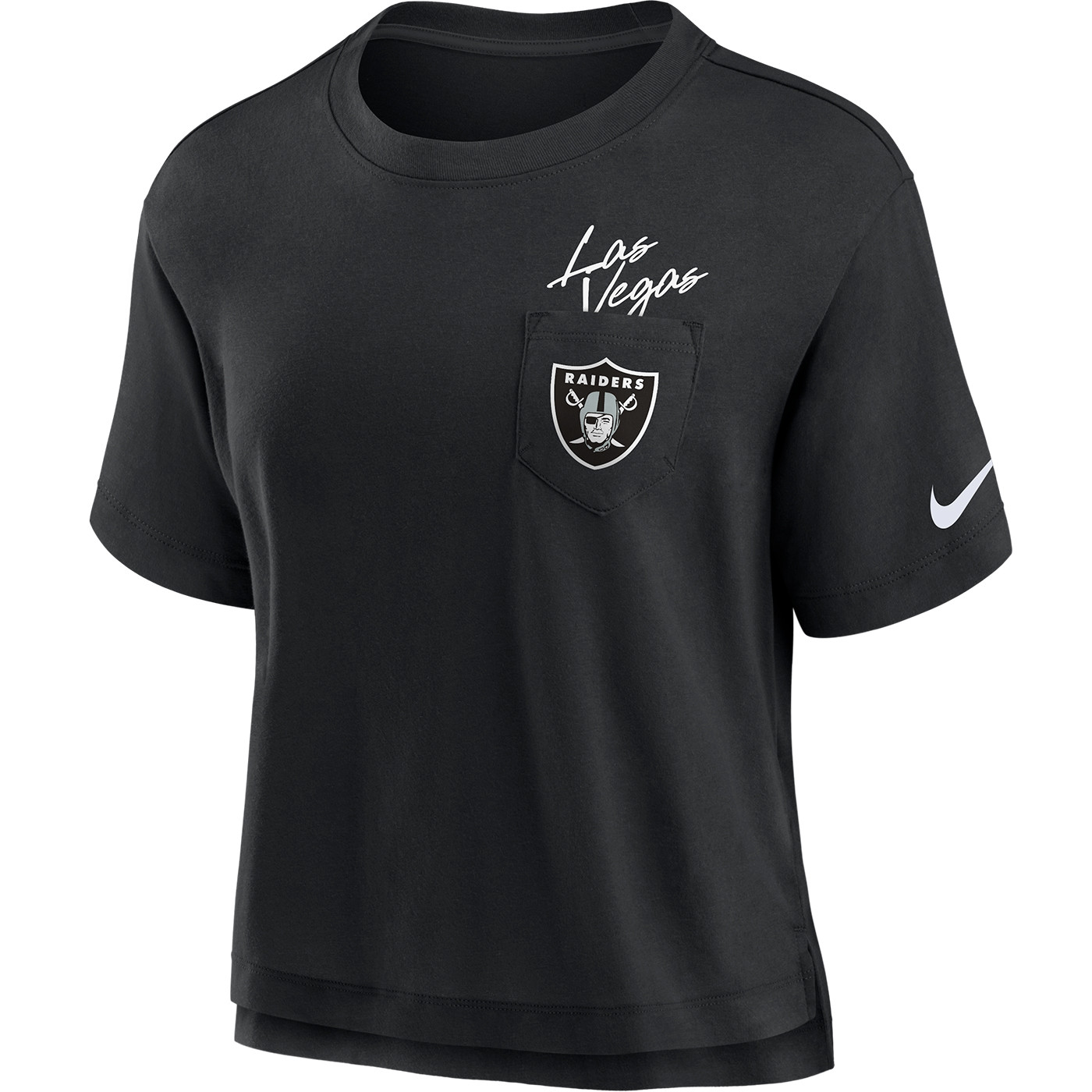 The Raiders Nike Women's Dri-FIT Cotton Pocket Tee is designed with Dri-FIT plated jersey fabrication to wick away moisture and keep you comfortable all day long. This boxy tee hits just above the hip and features a team shield logo printed on the the upper left chest pocket that partially covers additional "Las Vegas" script. 57% cotton, 43% polyester.