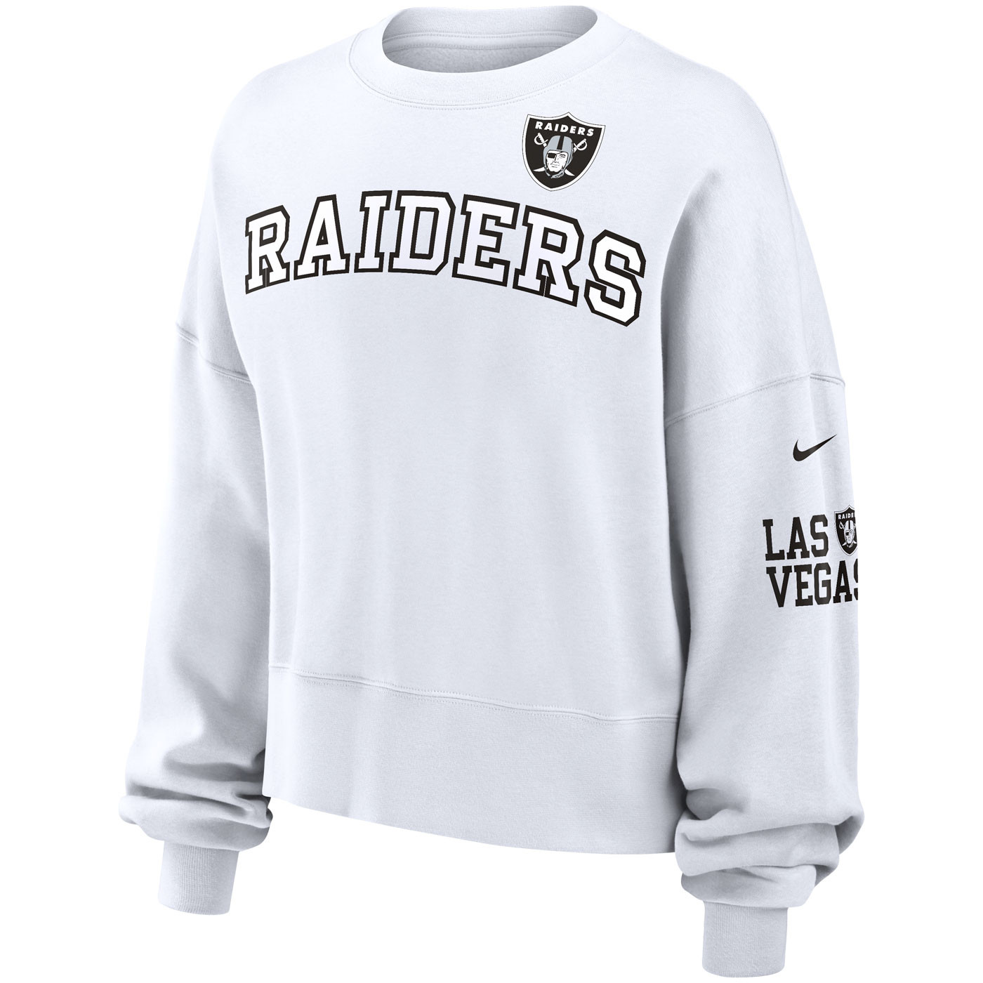 Embrace a blend of style and coziness with the Nike Women's Oversized Crew Fleece Sweatshirt. This midweight pullover features an oversized fit for ultimate comfort, with extended ribbed cuffs and waistband for a versatile look. Show off your team spirit with printed Las Vegas Raiders block graphics and the team shield logo on the front and left sleeve. 82% cotton, 18% polyester.
