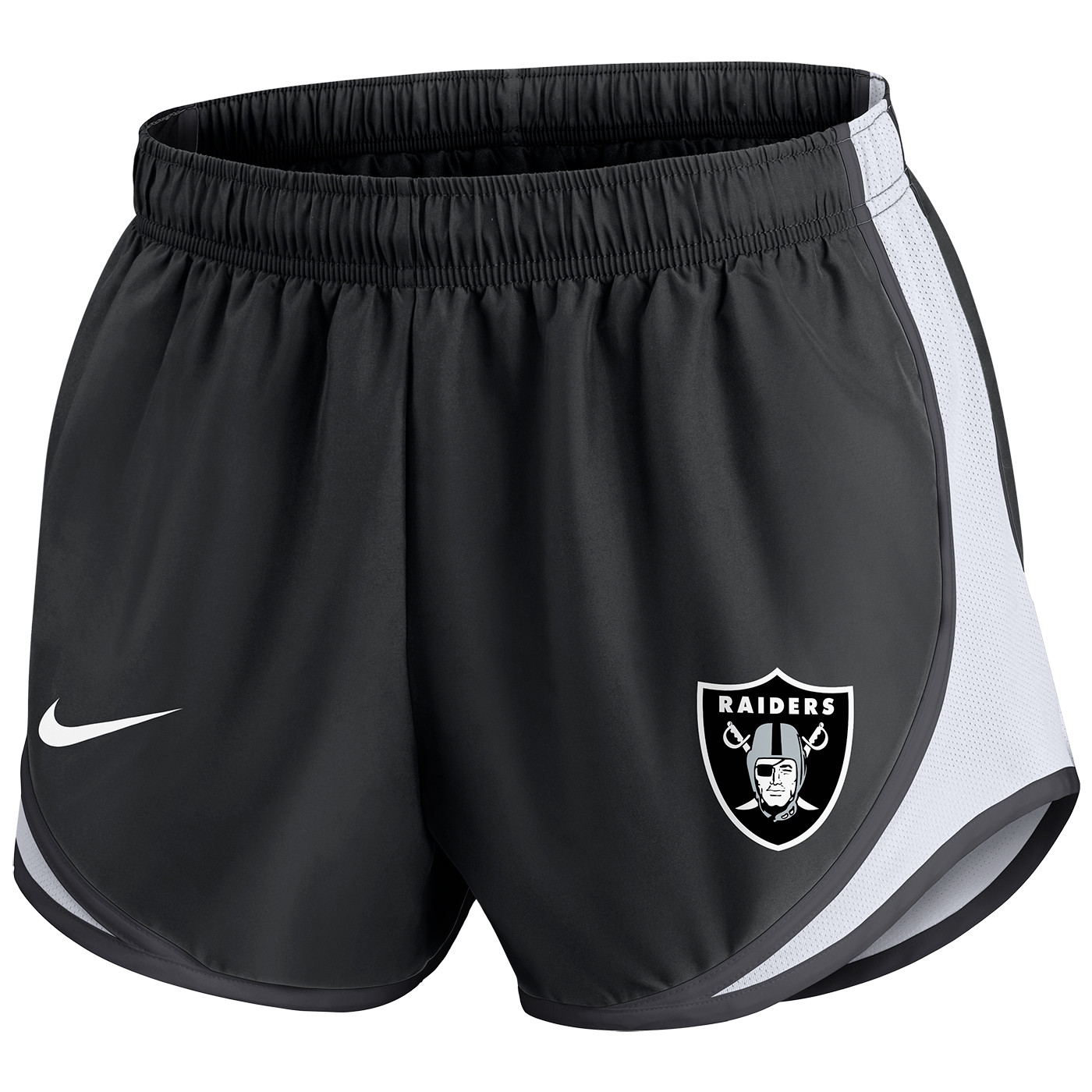 The Raiders Nike Women's Tempo Shorts are designed with an elastic waistband and lightweight Dri-FIT fabrication. These athletic shorts feature alternate team-colored side panels and a team shield logo printed at lower left leg. 100% recycled polyester.