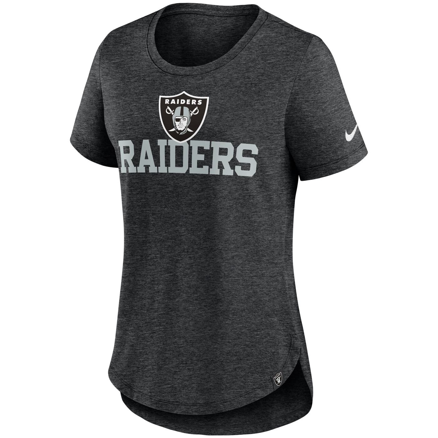 Elevate your gameday wardrobe with the Nike Women's Tri-Blend Fashion Top, designed for comfort and style. Made from heathered tri-blend fabric with a rounded droptail hem, this top boasts a printed team shield logo with bold Raiders print that's sure to turn heads wherever you go. 50% polyester, 25% cotton, 25% rayon.