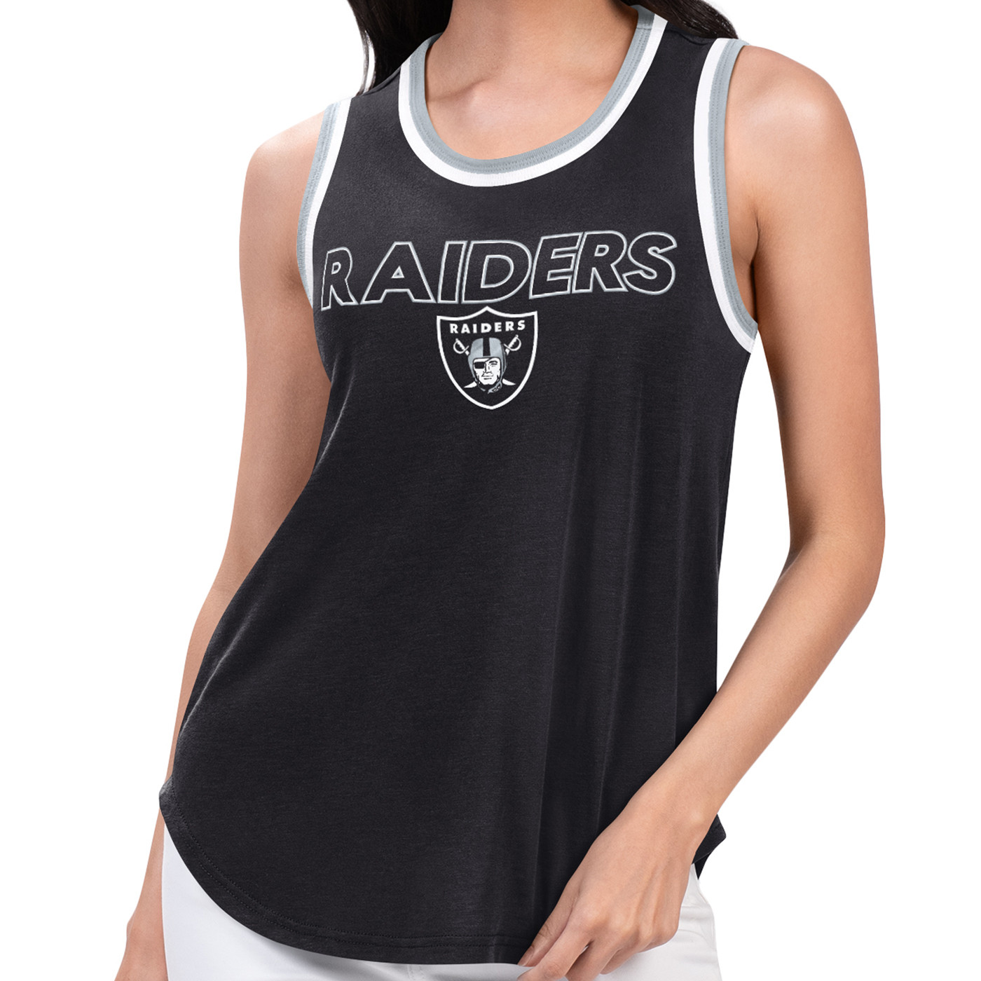 Get into the game with the Strategy Tank by GIII. Designed with performance fabrication to provide the perfect blend between cooling and comfort, this tank top features "Raiders" and team shield logo print across the chest, with additional team colored trim around the collar and arms.