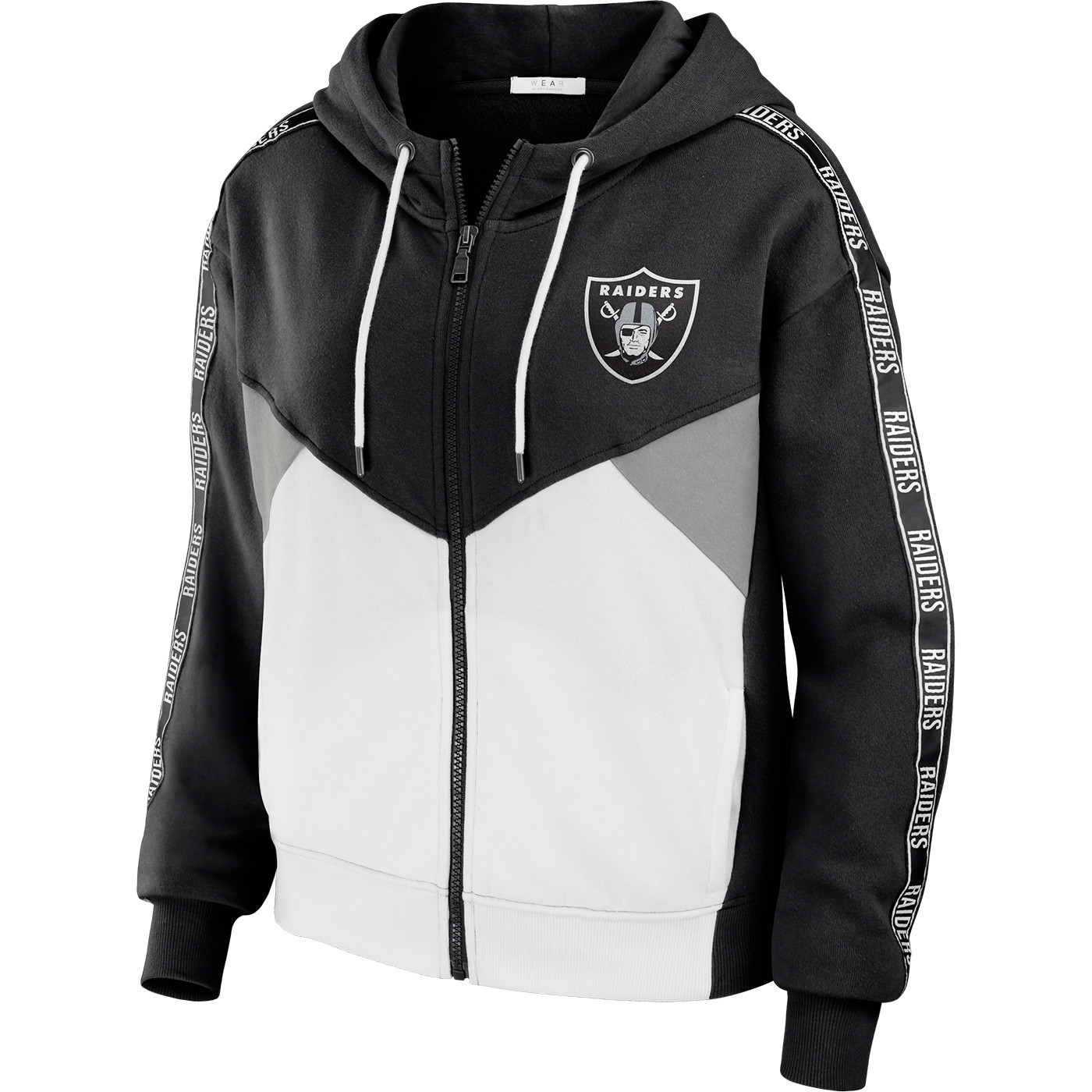 The Raiders WEAR by Erin Andrews Colorblock Full Zip Hoodie is designed with soft fleece fabrication and a wide ribbed waistband for a cozy fit. This hoodie features team shield logo print at upper left chest and has repeat "Raiders" jacquard taping from shoulder to cuff on each sleeve. 60% cotton, 40% polyester.