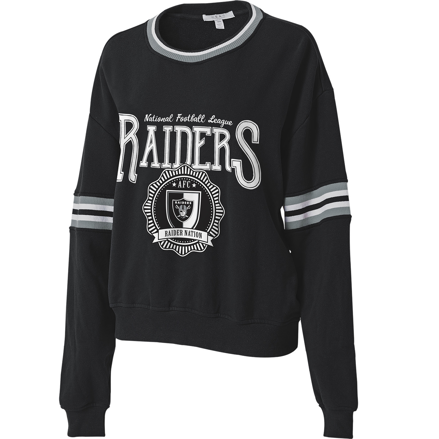 The Raiders WEAR by Erin Andrews Crew Pullover is designed with drop shoulders and loose sleeves for a slouchy fit. This sweater is slightly cropped to sit right at the hips and features alternate team-colored stripes at the collar and sleeves, plus vintage-inspired league, division, and team name print. Made from cotton, polyester French Terry.