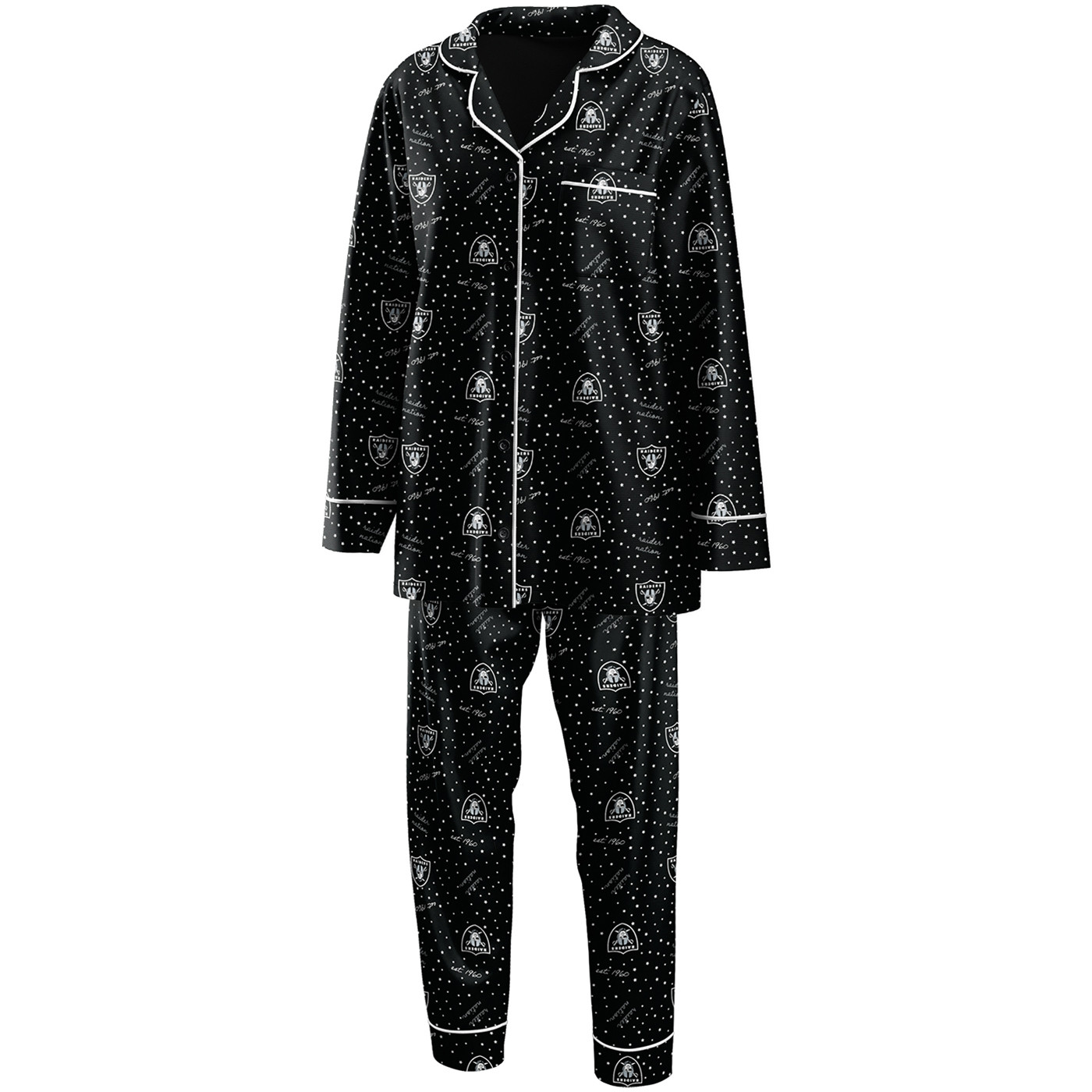 Wake up ready to cheer on the Raiders with the WEAR by Erin Andrews Pajama Set. This matching sleep set includes a button-up top and drawstring pants that feature custom designed all over team print with the team shield logo, "Raider Nation", and established date. 95% polyester, 5% elastane.